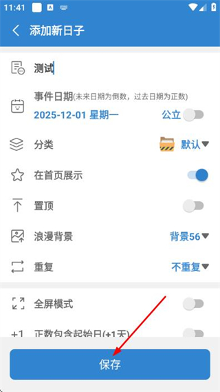 3、完成信息填写后,点击页面底部的保存按钮,完成新日子的添加操作。