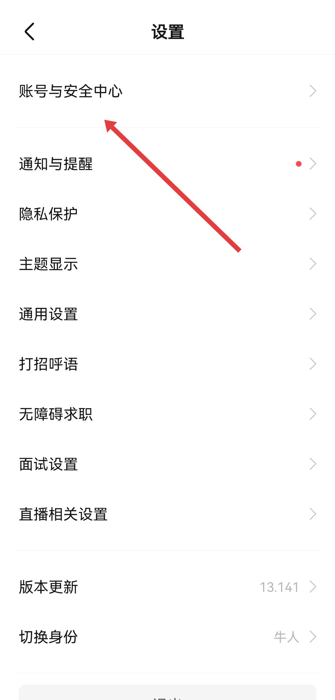 1、打开Boss直聘app进入我的的页面,点击右上角齿轮形状的设置图标,在设置列表中找到并点击账号与安全中心。