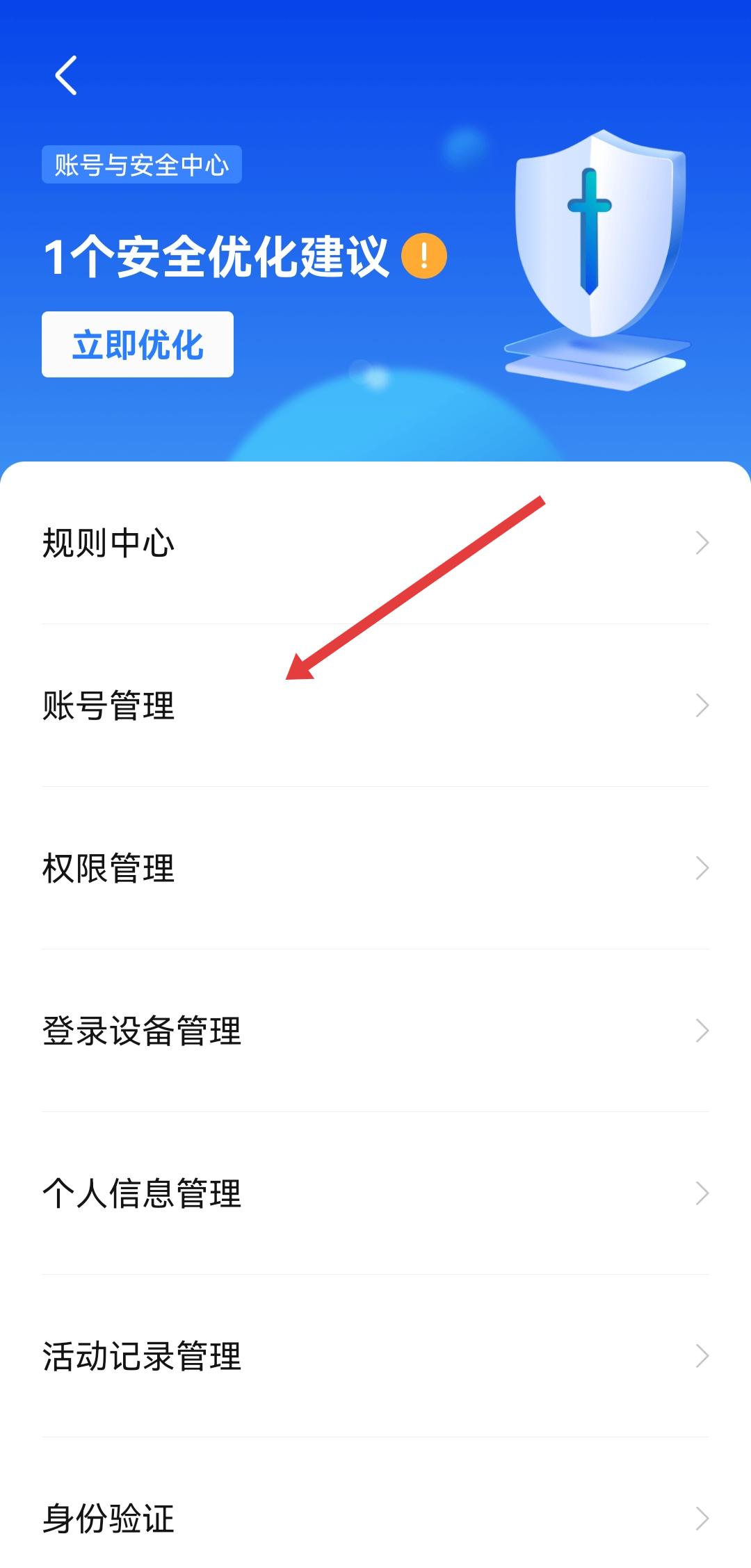 3、在帐号与安全中心页面,点击账号管理选项。
