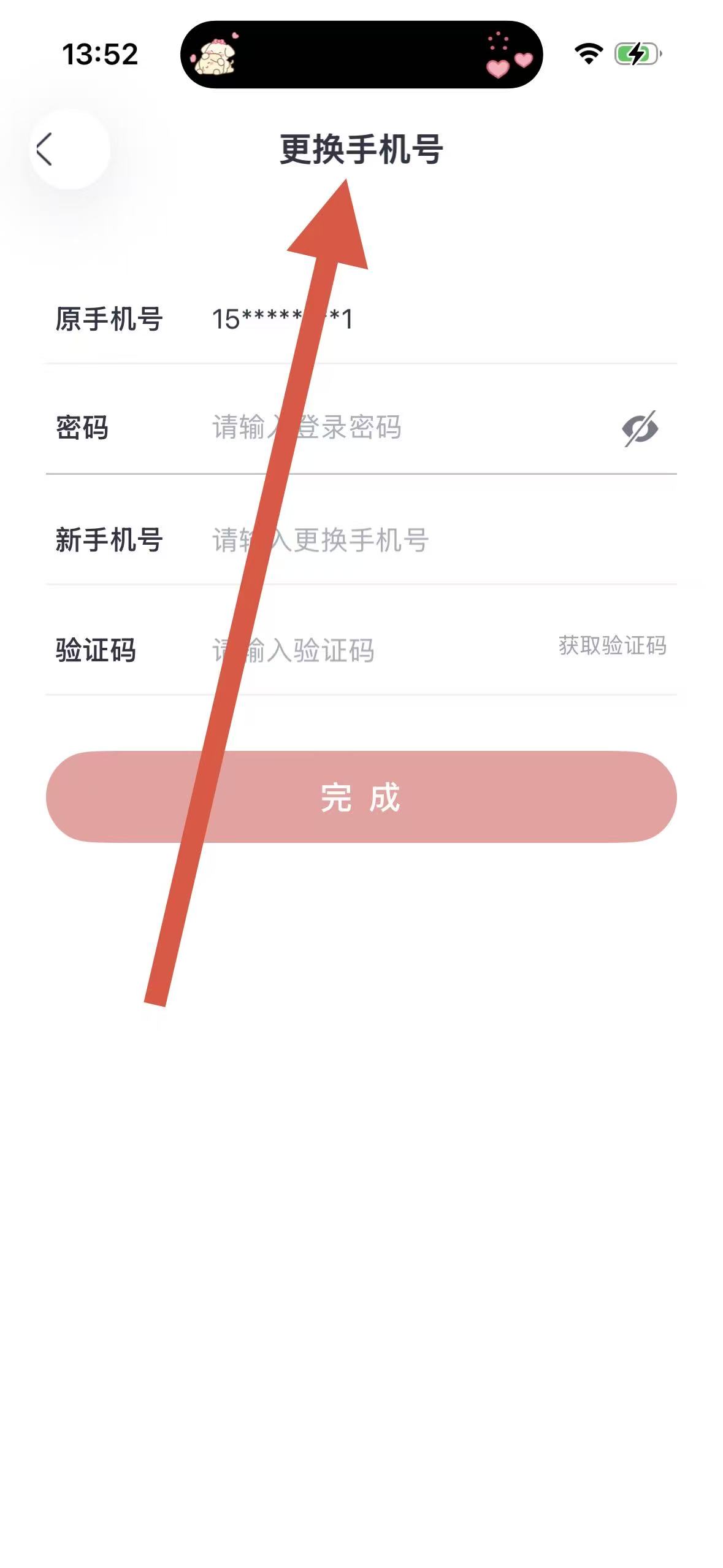 4、在更换手机号页面,输入原手机号、密码、新手机号以及获取的验证码,然后点击完成,即可完成手机号更换操作。