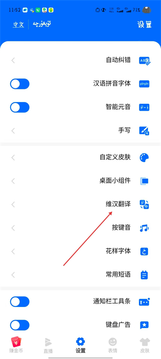 2、在设置页面,点击维汉翻译选项。