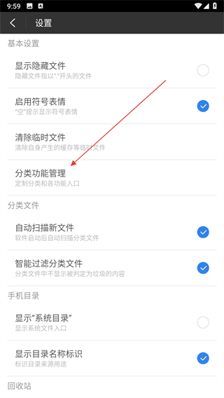 3、在设置页面中点击分类功能管理进入分类功能的管理页面。