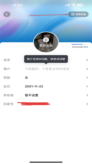 3、进入个人信息的页面内,点击右上角更换封面的按钮。