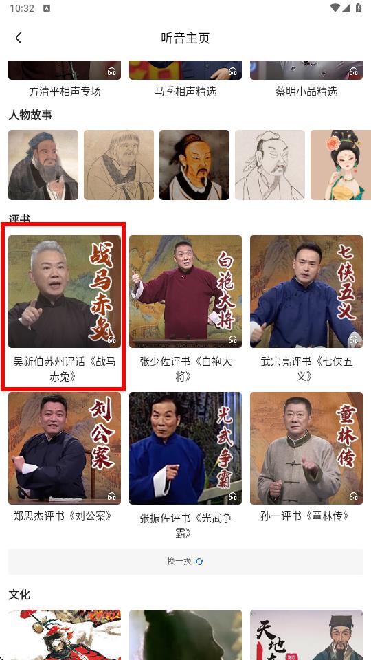 2、在听音主页找到想听的节目,如吴新伯苏州评话战马赤兔。
