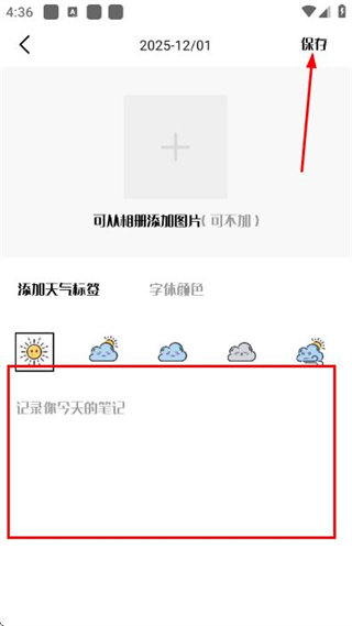 3、在新建笔记页面填写内容、选择天气标签后,点击右上角的保存按钮完成阅读笔记的创建。