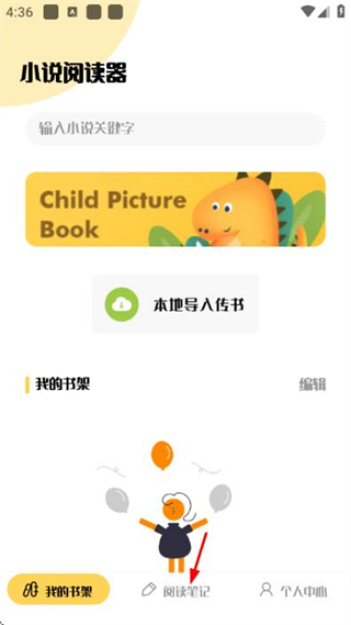1、在首页点击底部的阅读笔记选项,进入阅读笔记页面。