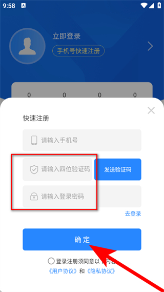 5、输入验证码,设置登录密码后,勾选协议,点击确定,完成注册。