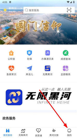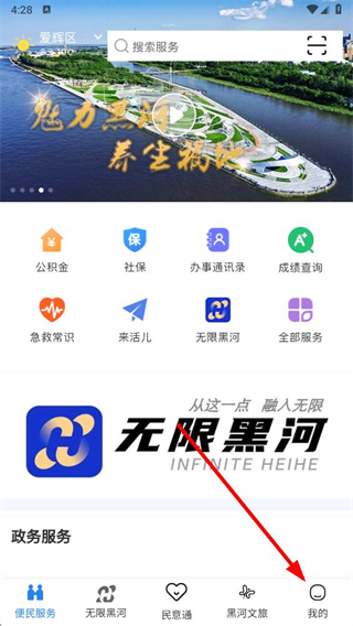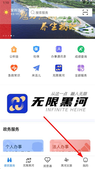 1、打开我的黑河APP后,在底部导航栏找到我的选项并点击。