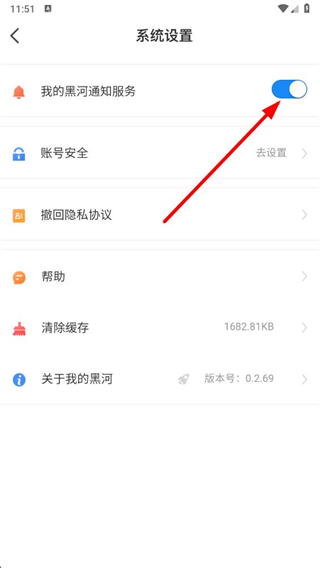 3、在系统设置界面,找到我的黑河通知服务选项,点击其右侧的开关按钮,即可关闭通知功能。
