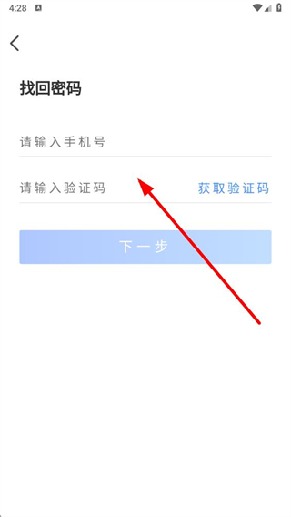 4、在找回密码页面,输入注册时绑定的手机号,获取验证码输入,点击下一步完成后续密码重置操作。