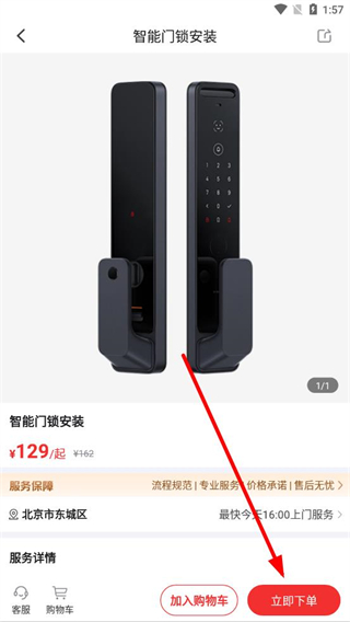 3、在智能门锁安装服务详情页面,点击立即下单按钮。