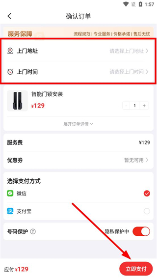 4、在确认订单页面,选择上门地址和上门时间,确认支付方式后点击立即支付,完成下单找师傅操作。