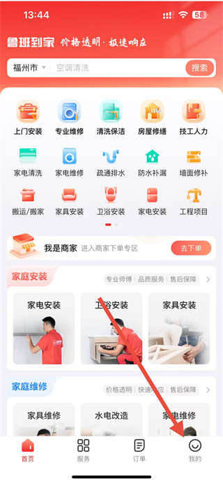 1、在鲁班到家app首页底部,找到我的选项并点击。