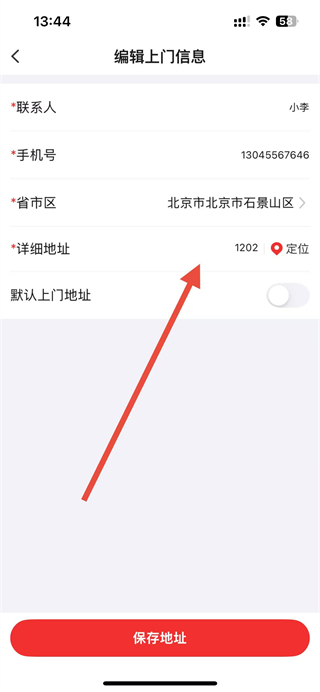 4、在编辑上门信息页面,修改详细地址等信息,修改完成后,点击保存地址即可完成地址信息修改。