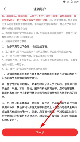 5、在注销账户页面阅读相关须知后,点击下一步,按照提示完成账号注销操作。