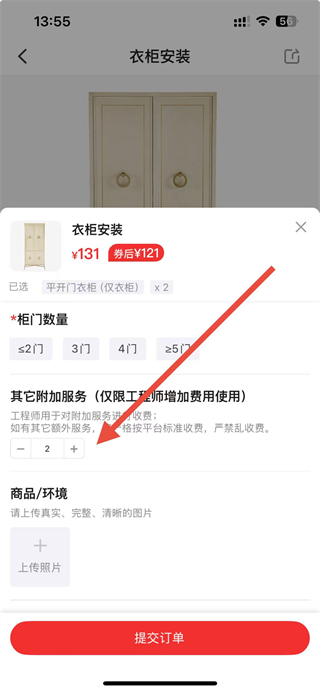 4、在下单页面,调整数量为2,填写柜门数量等信息后,点击提交订单按钮即可。