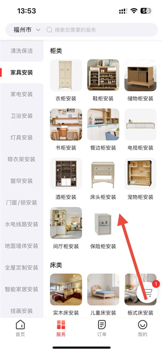 2、在服务页面,根据个人选择要安装的家具类型。