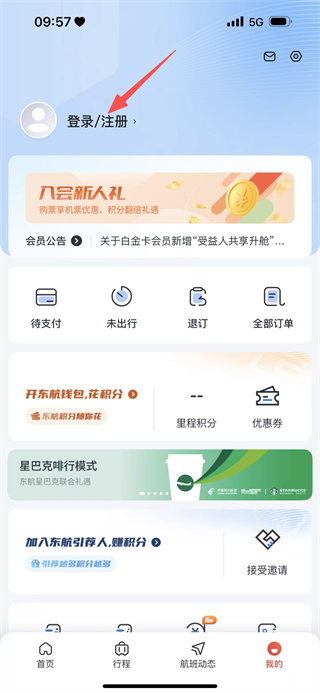 1、在掌上东航应用首页,点击底部我的,进入个人页面。