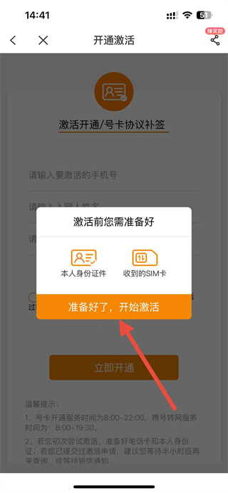 3、激活前需准备本人身份证件和收到的SIM卡,确认材料齐全后点击开始激活按钮。