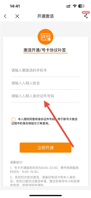 4、在页面依次填写要激活的手机号、入网人姓名、入网人身份证件,勾选协议后,点击立即开通完成激活。