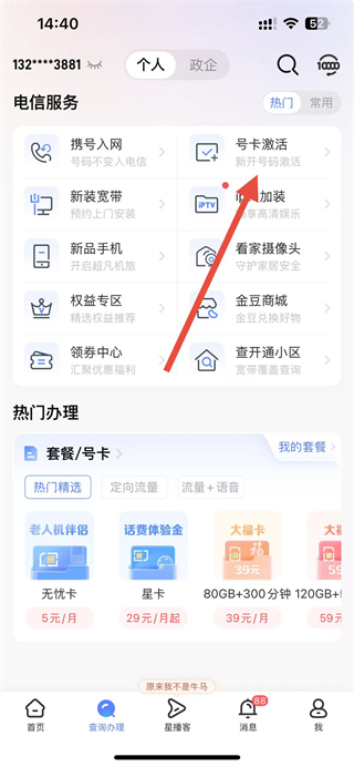 2、在电信服务页面,找到号卡激活选项并点击,进入新卡激活的流程入口。