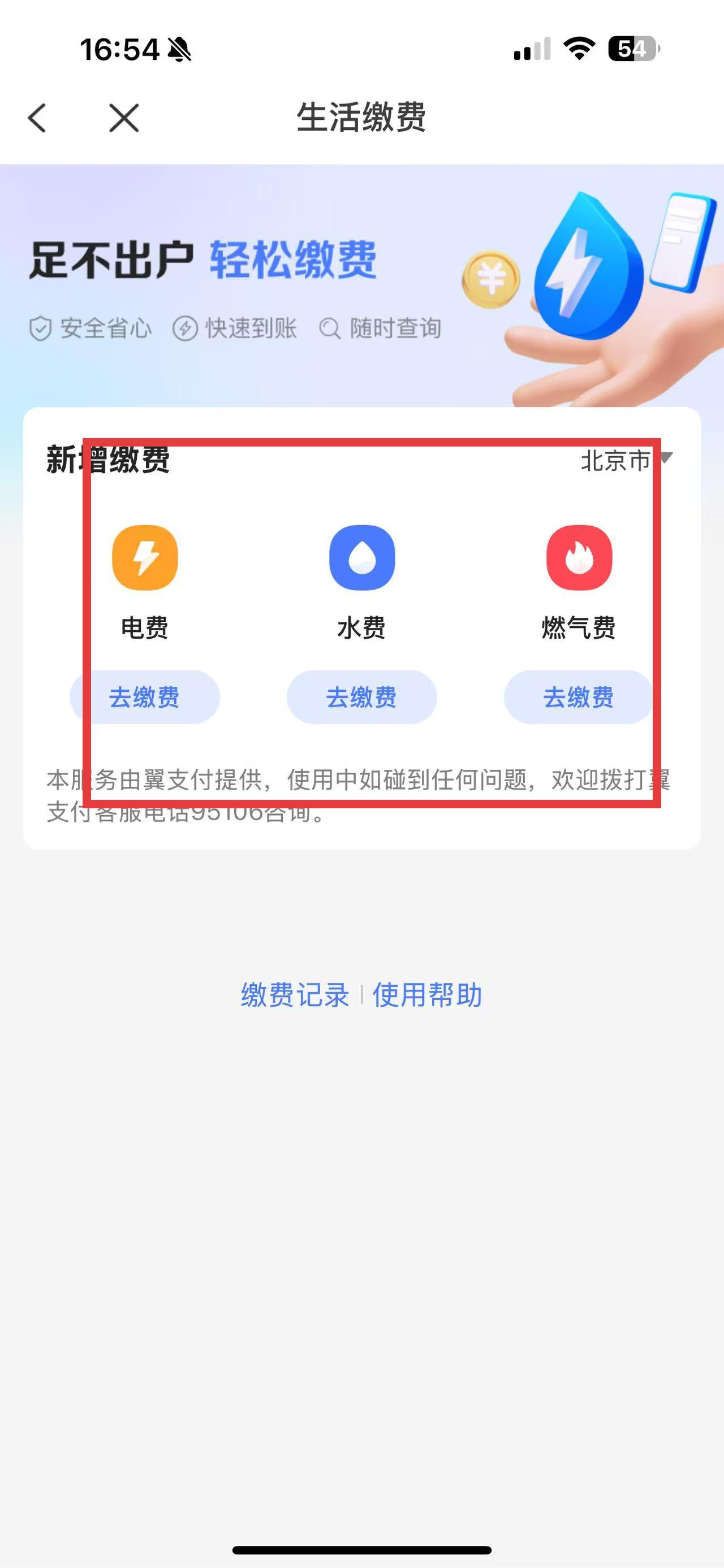 2、在生活缴费页面,您可以看到电费、水费、燃气费等缴费选项,点击需要缴费项目对应的去缴费按钮。