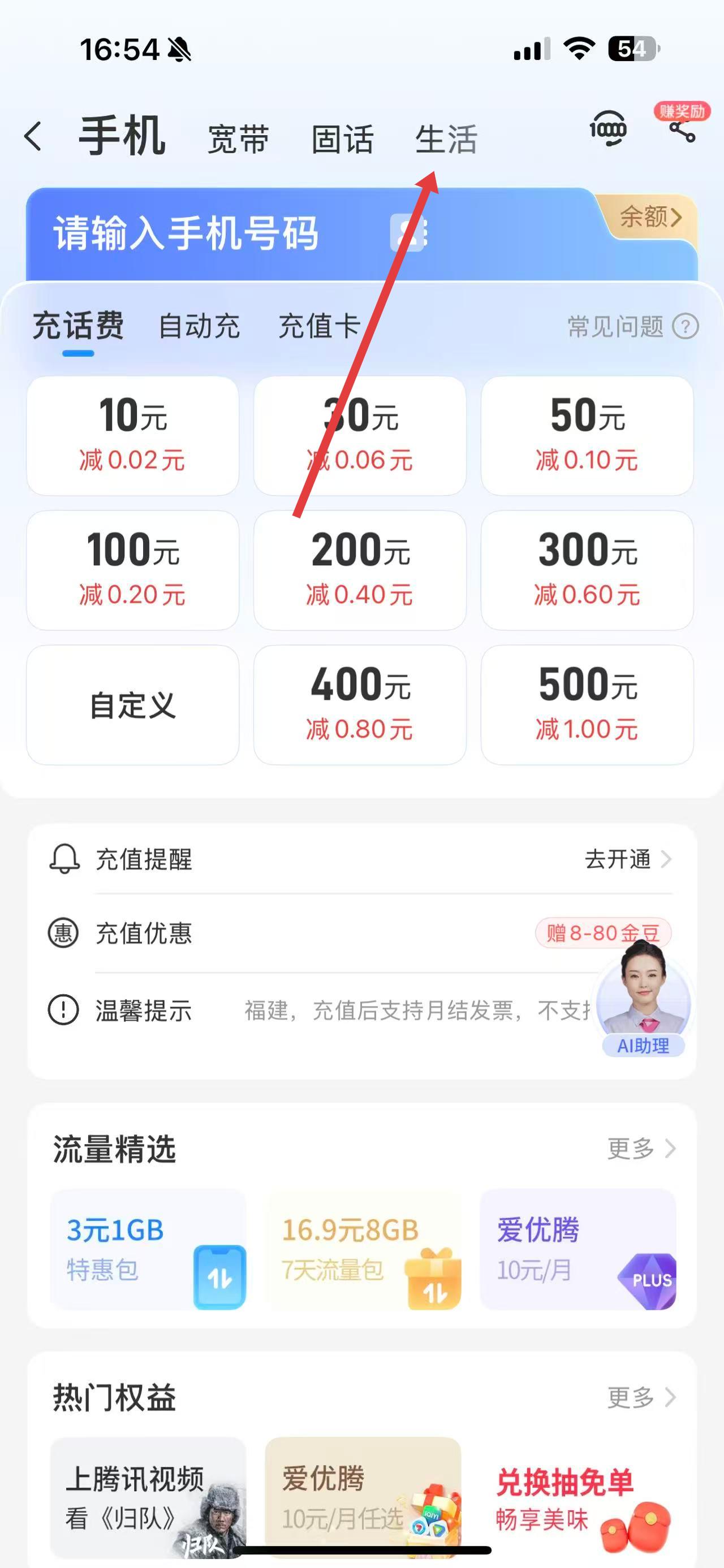 1、打开中国电信手机营业厅APP,进入充话费界面后,点击顶部导航栏中的生活选项。