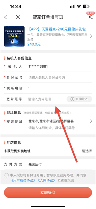 4、在智家订单填写页,完善装机人身份信息和地址等内容,勾选协议后,点击立即提交完成业务办理。