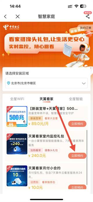 2、在智慧家庭页面,选择天翼看家室内监控礼包,点击其右侧的立即预约按钮。