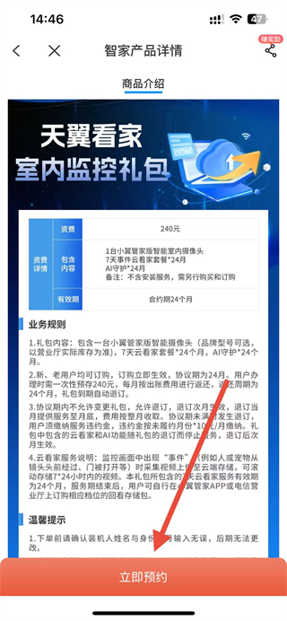 3、进入智家产品详情页,查看天翼看家室内监控礼包的资费、业务规则后,点击底部立即预约。