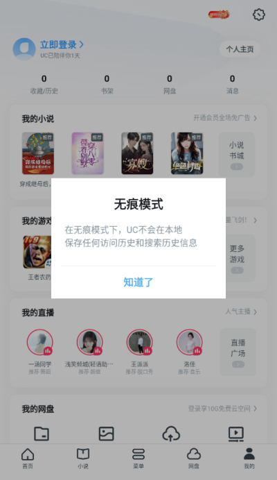 3、点击后在屏幕上即可弹出开启无痕模式的提示,在无痕模式下,uc不会在本地保存任何访问历史和搜索历史信息。