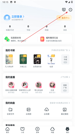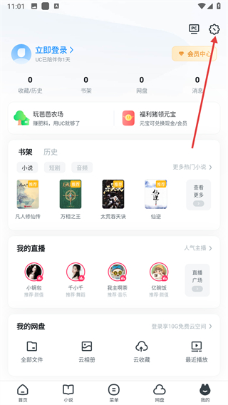 1、打开UC浏览器,进入个人中心页面,点击齿轮形状的设置按钮。