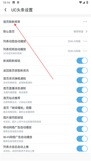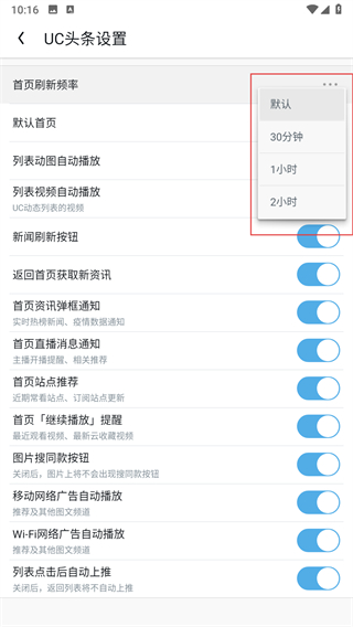 3、在UC头条设置页面找到首页刷新频率选项,点击三点按钮。