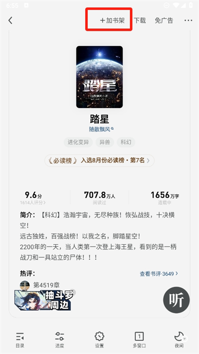 3、进入小说后为了方便下次继续观看小说历史进度,直接在这里点击+加书架即可;