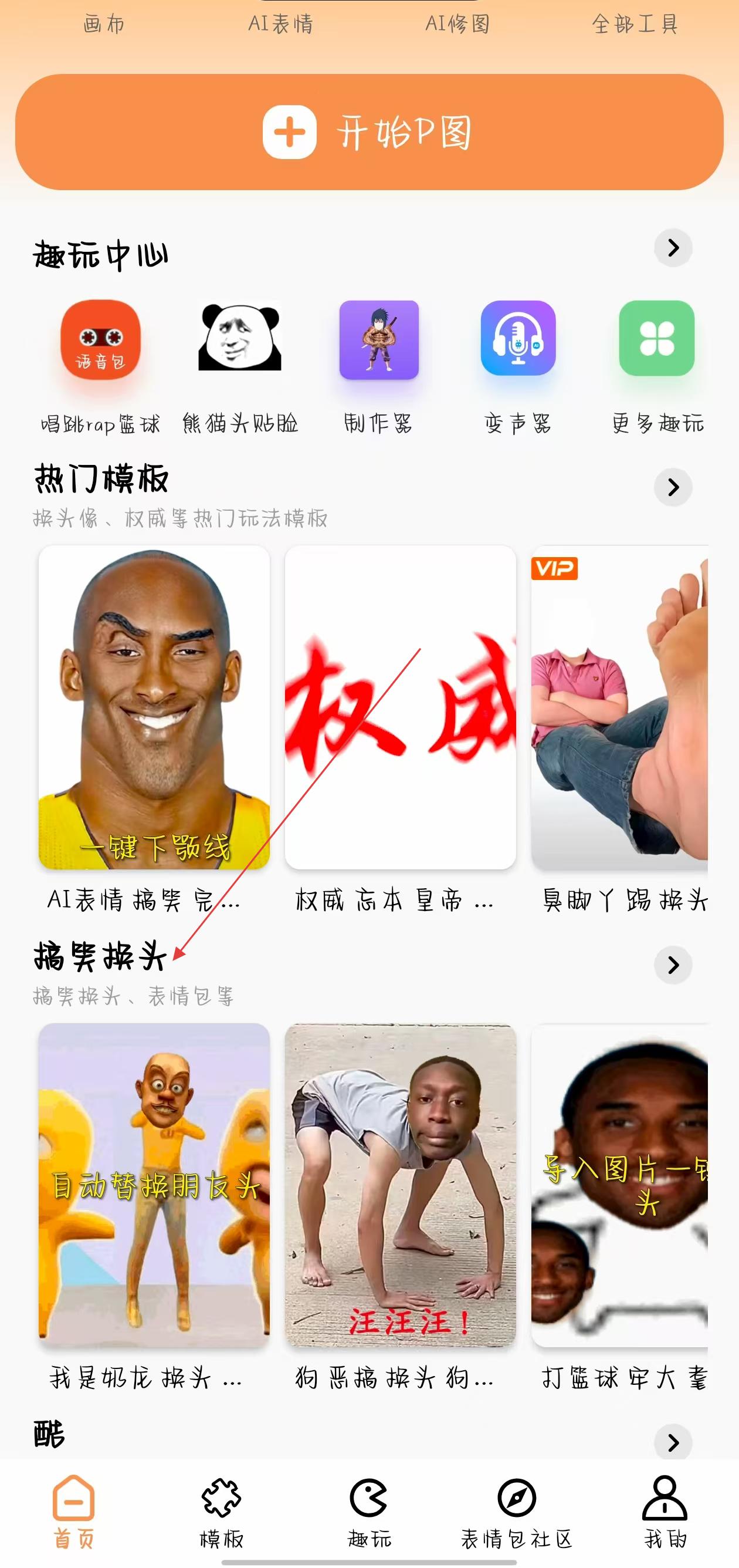 1、打开暴走P图App进入首页,在趣玩中心下方找到搞笑换头选项并点击进入换头操作界面。