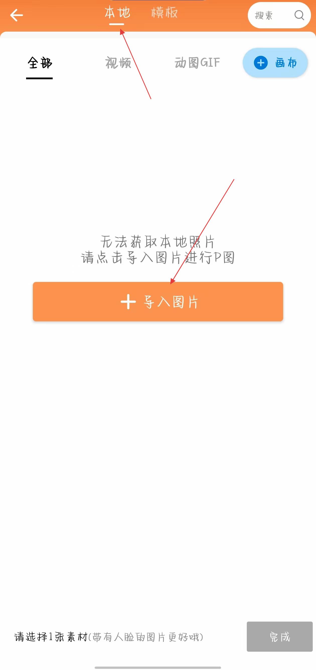 2、进入换头界面后,点击上方本地选项,再点击导入图片按钮,从手机相册中选择想要进行换头操作的图片。