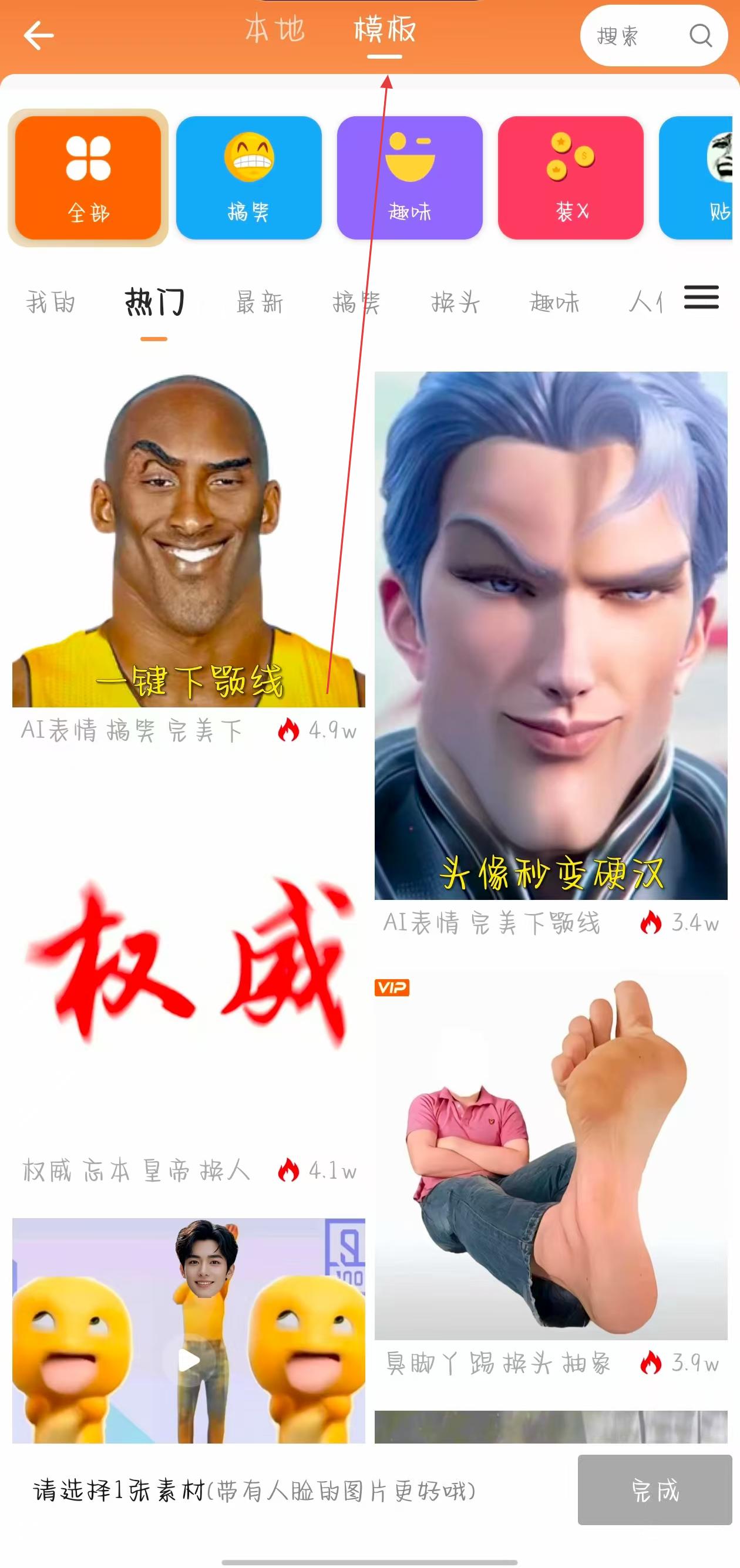 3、要是不想用本地图片,也可以点击上方模板选项卡,从App提供的热门、搞笑等分类模板中挑选合适的模板图片。