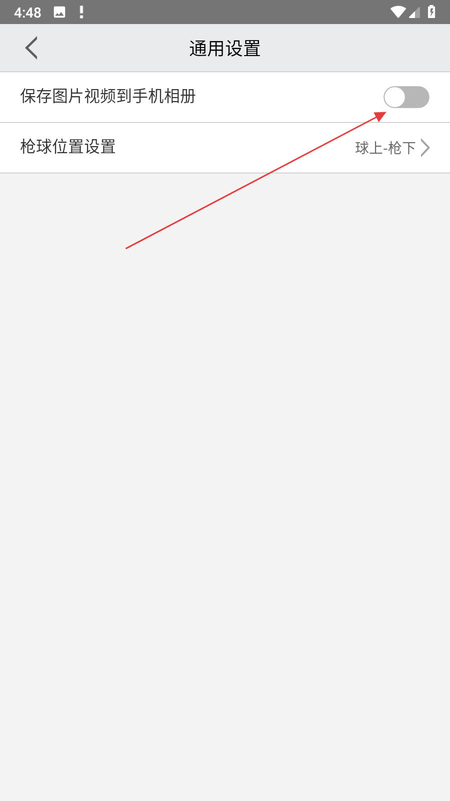 2、在通用设置界面里能看到保存图片视频到手机相册选项,其右侧是灰色关闭状态的开关按钮,点击该按钮。