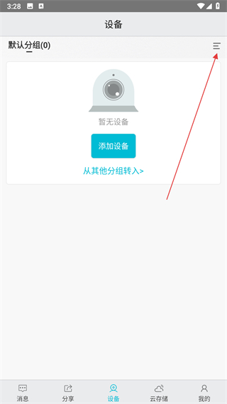 1、打开AView应用,进入设备页面,点击页面右上角的三条横线图标,进入分组管理页面。