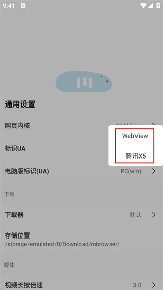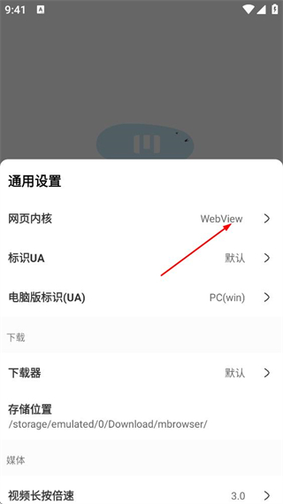 4、在通用设置页面,点击网页内核选项,打开网页内核的选择菜单。