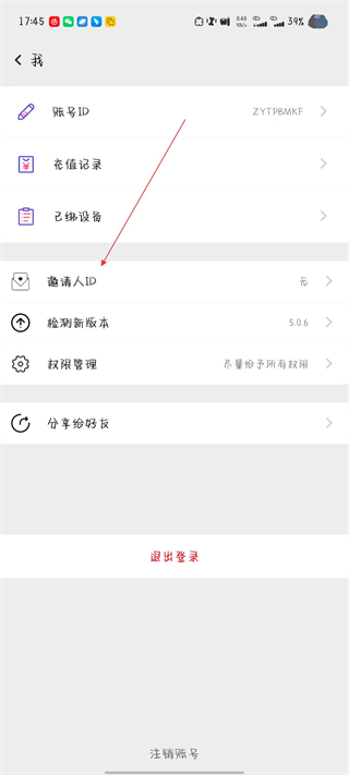 3、在设置界面中,点击邀请人ID,进入填写邀请码的页面。