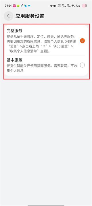 4、选择完整服务或基本服务其中一项,点击后即可完成设置的更改。