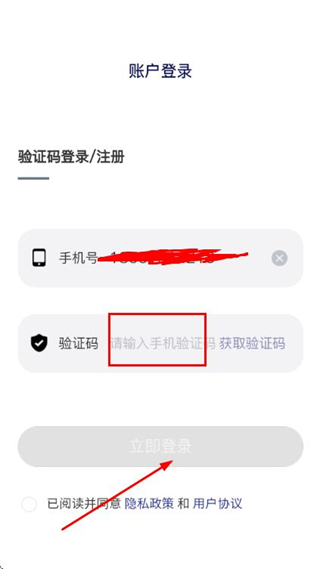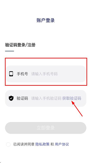 2、在登录页面填写手机号,勾选协议后,点击获取验证码。