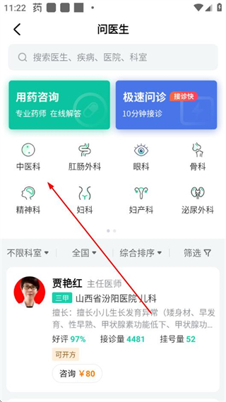 2、在问医生页选择目标科室,进入对应科室的医生列表页面。
