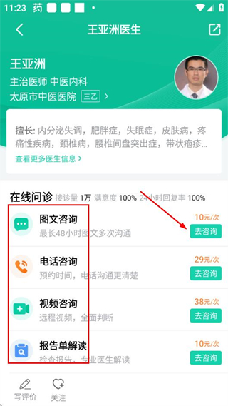 4、在医生详情页选择咨询方式,点击去咨询,即可发起线上问诊。