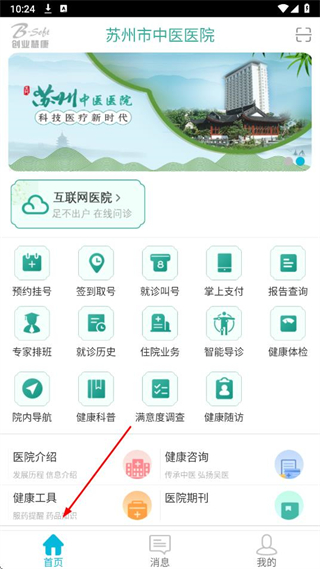 1、打开苏州市中医医院APP首页,点击预约挂号,进入预约挂号页面。