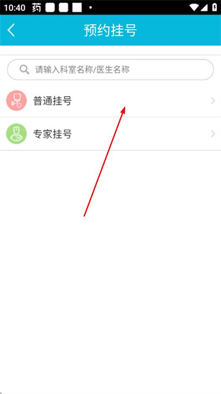 2、在预约挂号页选择普通挂号,进入科室选择页面。