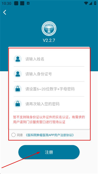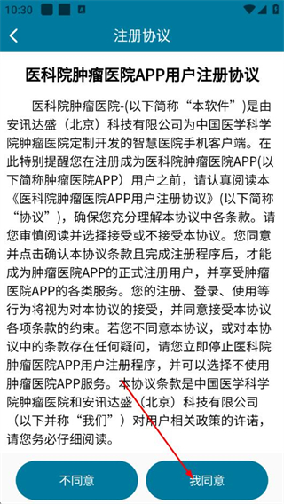 1、打开医科院肿瘤医院APP登录页,点击用户注册,进入注册协议页面。