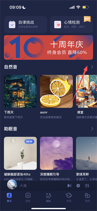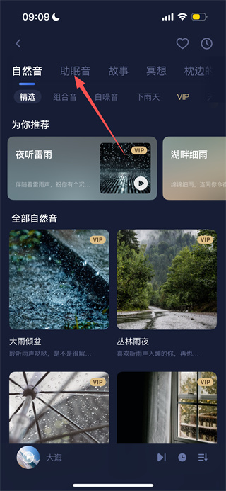 2、在自然音页面,点击助眠音标签,切换至助眠音页面。