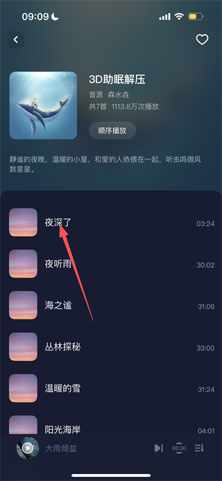 4、在内容详情页,选择夜深了,即可开始播放助眠音频。